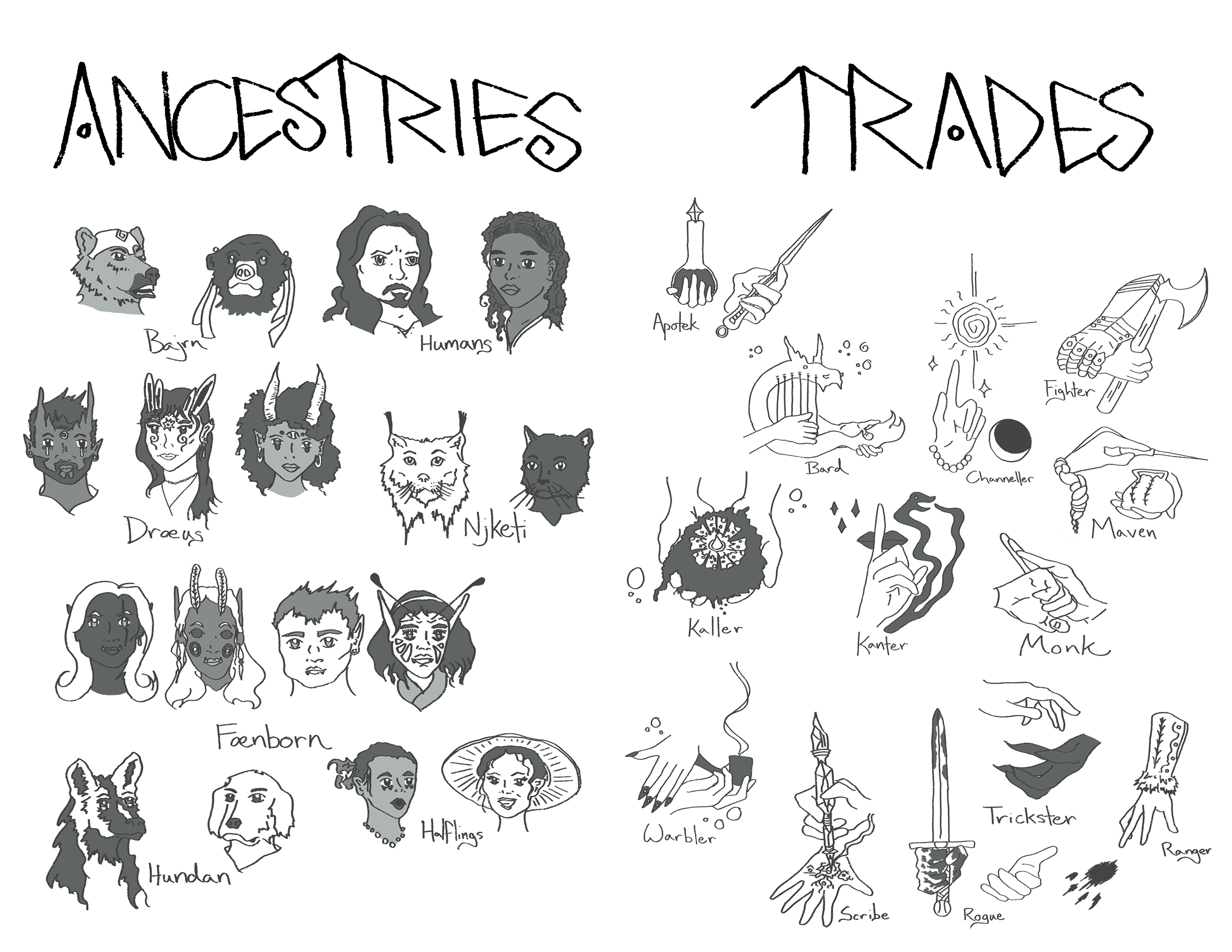 Runemaker is a d12 base system that runs on small numbers and even smaller contested rolls. Players rely on their body, mind, and vibes to navigate the world. Runemaker asks not only how Brawny or Agile you are, but how Disciplined? Do you have a good Memory? Are you Cunning? Maybe you lead with Empathy or rely on your Reason to solve problems. Or perhaps your Insight picks up on things others miss.